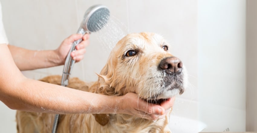 - הרטיבו את הפרווה בעדינות – התחילו מהצוואר ומטה והימנעו מהרטבת הראש ישירות כדי לא להבהיל את הכלב.